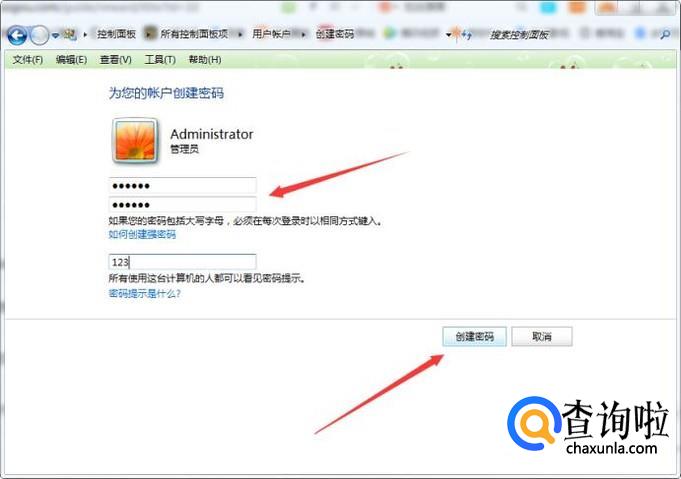 我们在下一个对话框中输入密码,确认密码,再点击创建密码。创建密码成功后,使用快捷键Windows+L键就能够锁屏