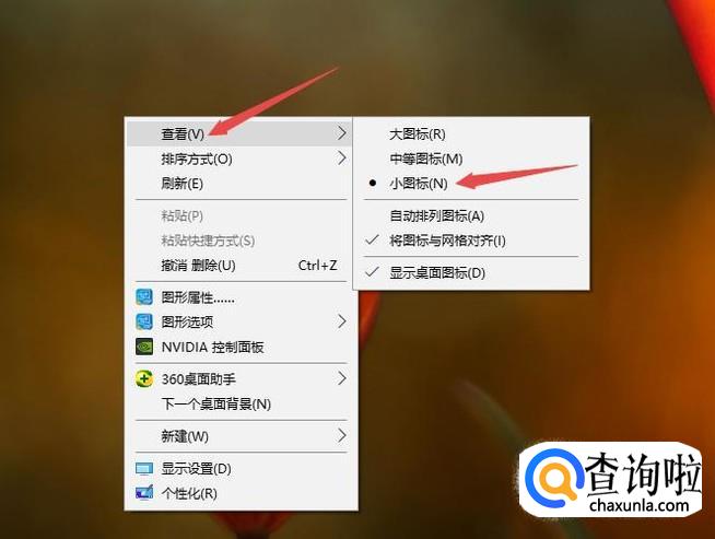 右击电脑桌面的空白处,弹出的界面,点击查看,之后点击小图标,这样就可以把电脑桌面图标调小了。