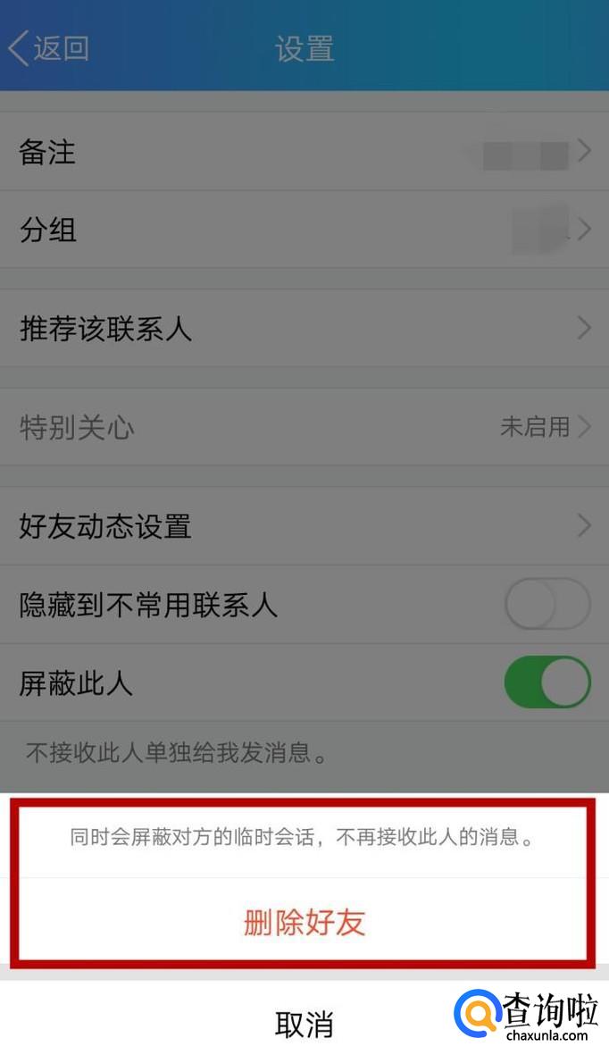 也可以在打开“屏蔽此人”开关后再点击“删除好友”,就可以彻底拉黑此人。