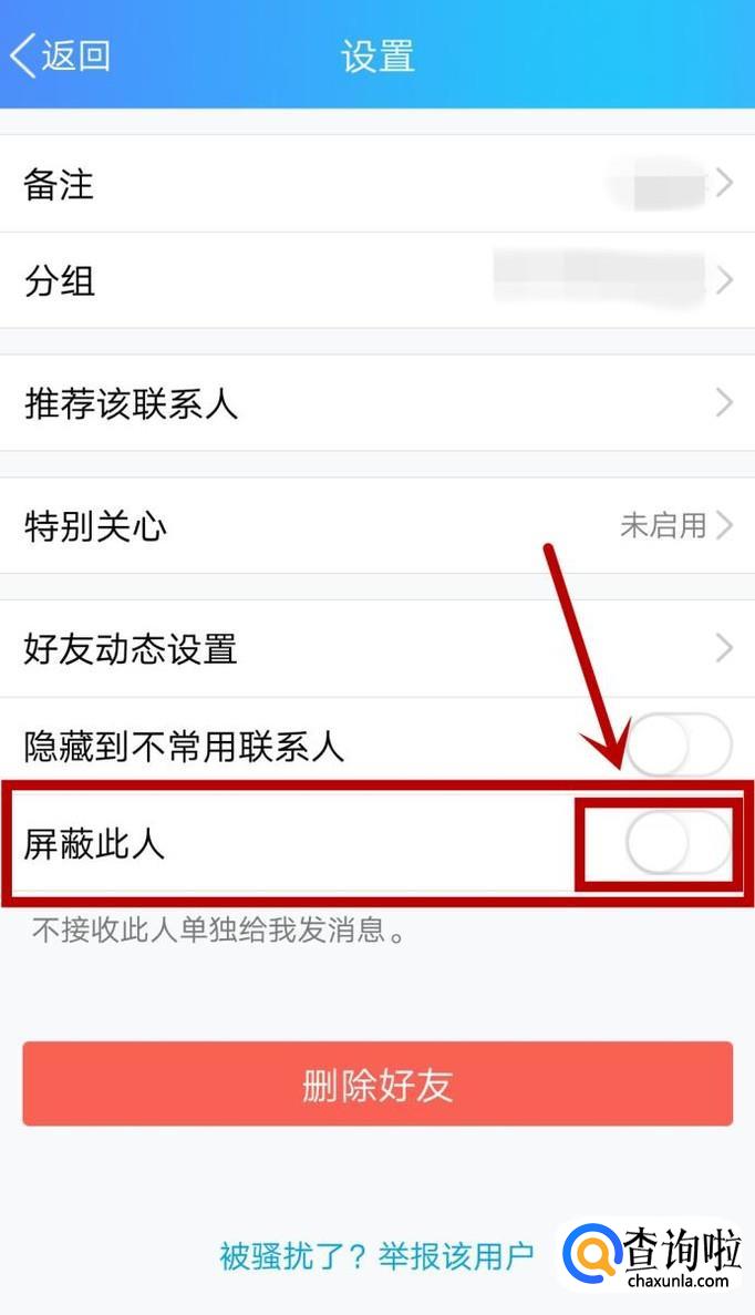 进入设置页面后,打开“屏蔽此人”一栏后面的开关,即可拉黑此人;