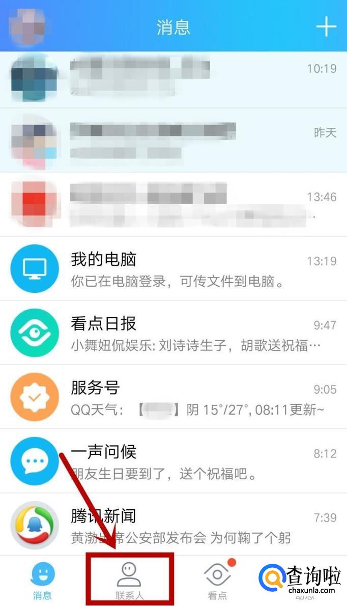 登陆进入手机qq,点击下方的“联系人”,在联系人列表中找到你想要拉黑的陌生人;