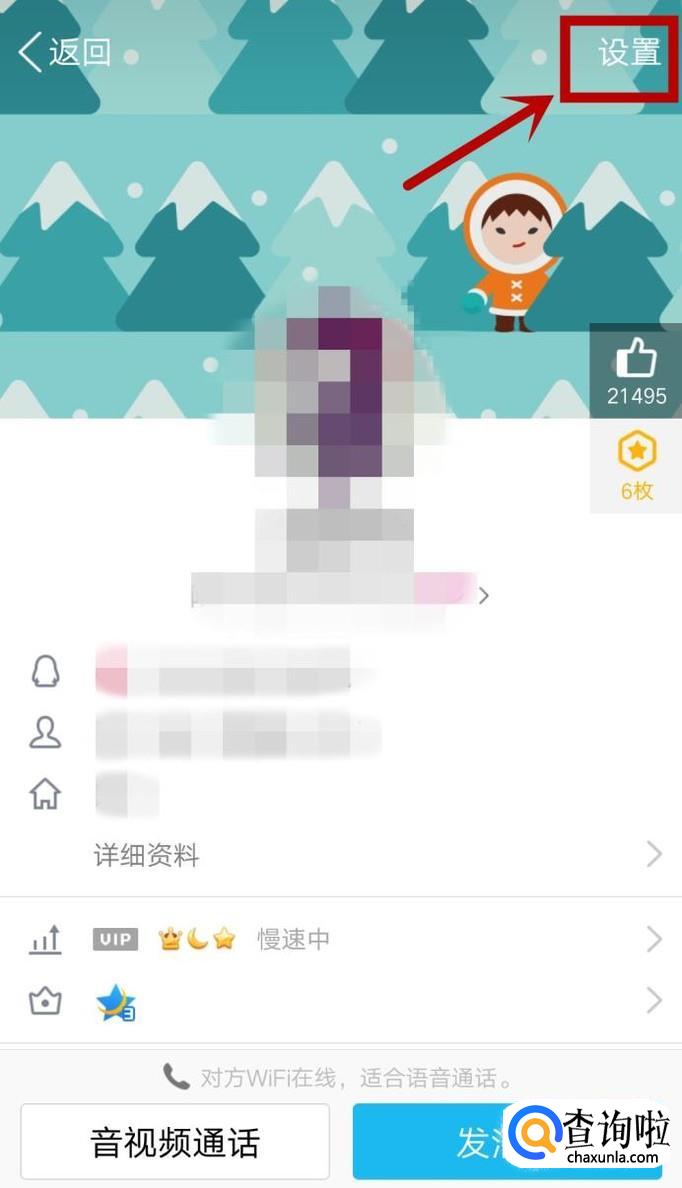 点击此人,进入他的个人主页,然后点击右上角的“设置”;