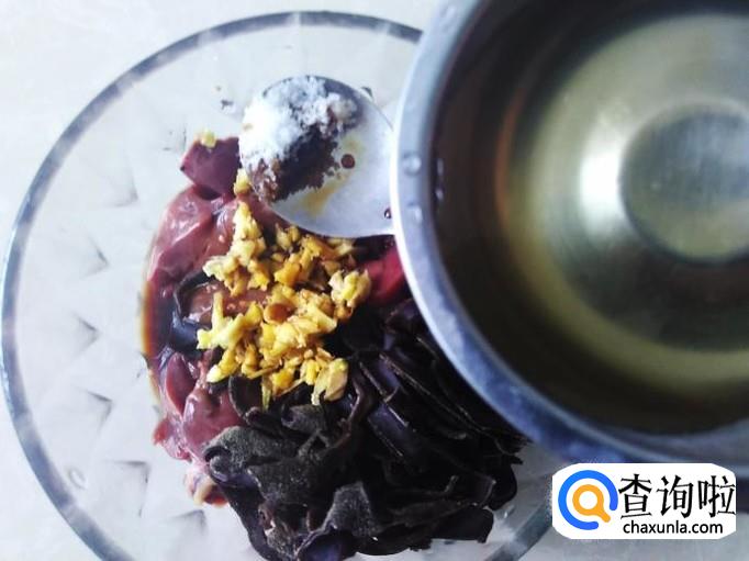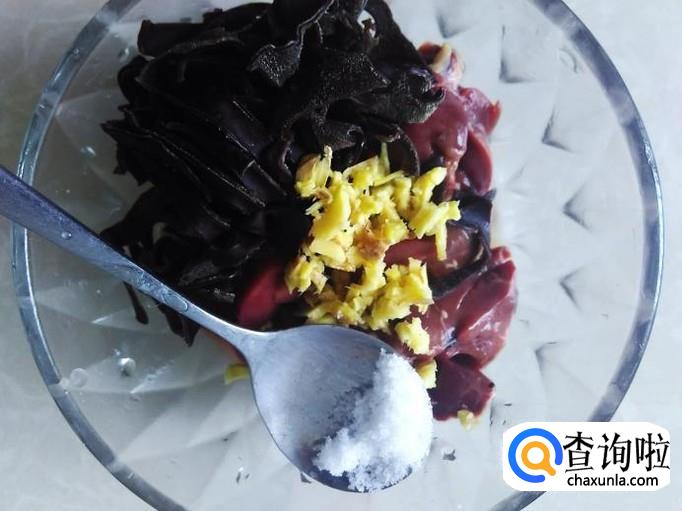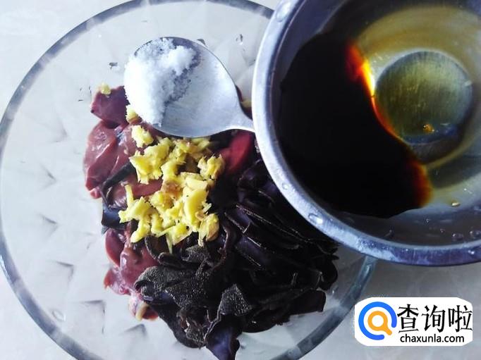 把木耳、鸡肝放到碗里,加适量的盐、姜蓉。