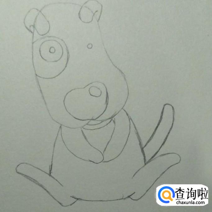 然后再先画出小狗的前面两只脚与其鼻子,接着画其尾巴,身体与后脚,当然,为了逼真且与现实相符,我们会用橡皮擦擦去后脚与身体想重合的部分。接着在小狗脖子处画两条弧线。