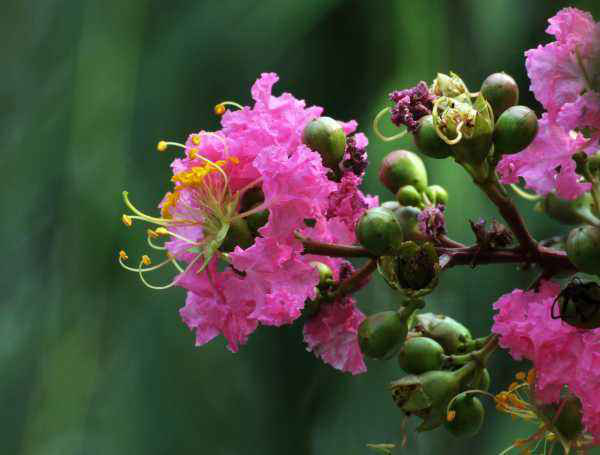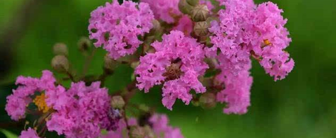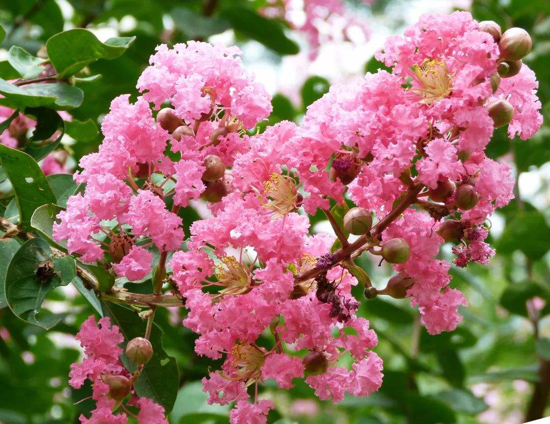 紫薇是千屈菜科,属落叶灌木,是观赏树种,多分布于我国华东、华中、华南以及西南诸省。别称有“痒痒树”“百日红”“无皮树”,紫薇树姿优美、树干光滑洁净,花色艳丽。宋代诗人王十朋用“盛夏绿遮眼,此花红满堂”来形容紫薇,是因为紫薇花期在6~9月,花期很长,同时这个时间正处夏秋,少有开花树种。