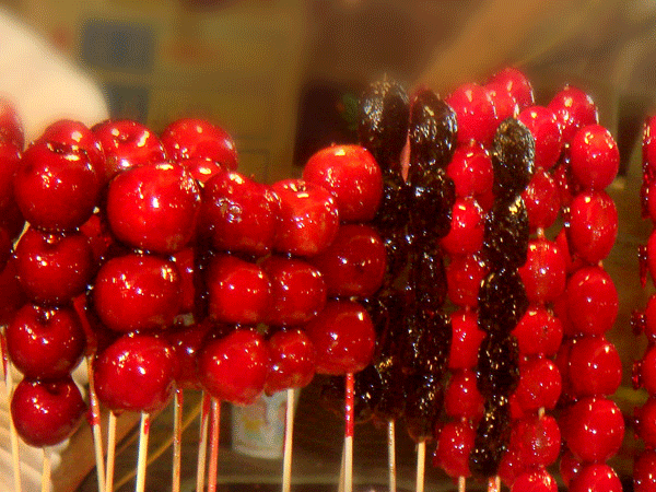 冰糖葫芦充满了小时候的记忆,实在是……允许小编咽一下口水~火红的山楂,碧绿的猕猴桃,清甜可口的香蕉,色彩艳丽的桔子瓣,用细竹签儿串成一串,裹上甜丝丝的麦芽糖,酸甜脆爽的味道,可以称得上世间的美味。当然最常见当属山楂了,糖浆香甜的气味,甜蜜的糖浆和水果的酸味混合在一起,wow~恨不得马上就吃到呀!