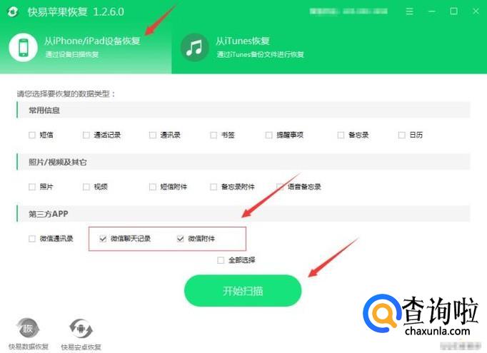 ‘从iPhone设备扫描恢复’,再选择要的类型,勾选“微信聊天记录”和“微信附件”,点击开始扫描。