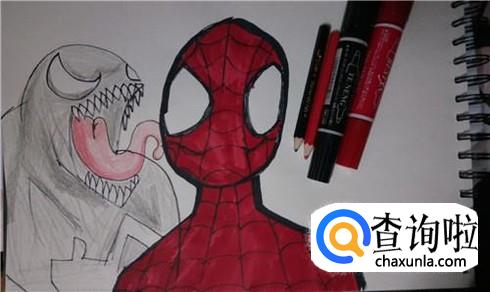 最后填充适合的颜色就行了。蜘蛛侠全身用红色的马克笔填充。毒液呈灰蓝色,这里我用黑色的彩铅慢慢涂的,显得更有层次感,他的舌头用红色彩铅填充,注意突出舌头的立体感。