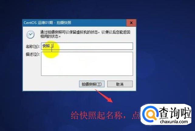 在弹出的拍摄快照界面中给快照起一个名称,然后点击拍摄快照按钮,如下图所示