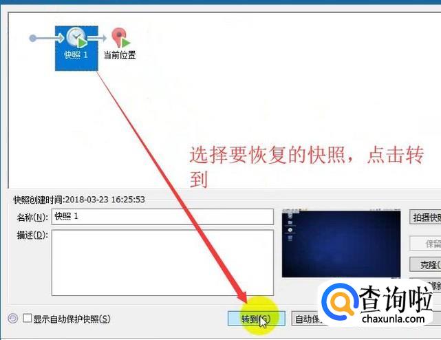 在快照管理器中选择要恢复的快照,然后点击转到按钮即可,如下图所示
