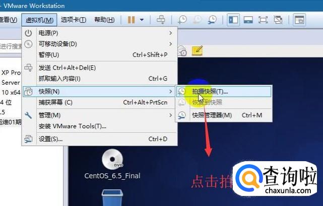 点击顶部的虚拟机菜单,选择快照下面的拍摄快照选项,如下图所示