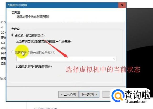 在弹出的克隆向导界面中选择虚拟机中的当前状态选项,如下图所示
