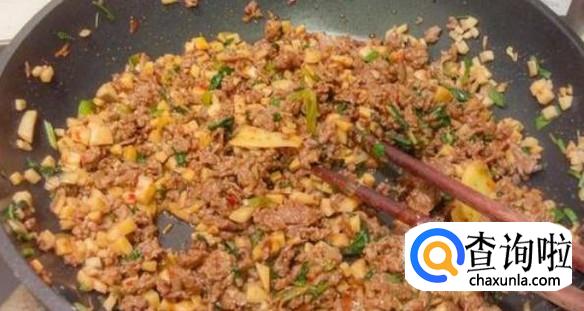 接下来放油进锅里,把腌制好的牛肉末和猪肉末一起放在油锅里炒,炒十多分钟颜色变黄,然后就加入姜葱蒜在里面,就可以盛出锅