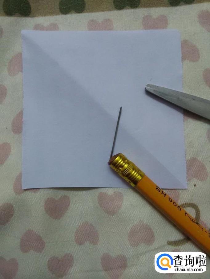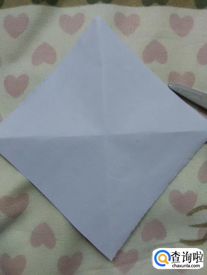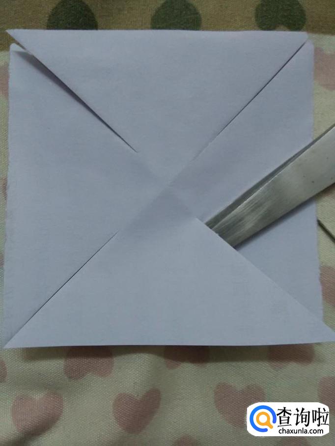 用剪刀沿着四个角的对角线往中心剪,但不要剪到中心,都距离中心一公分的地方停住。现在正方形被分成了四个三角形。