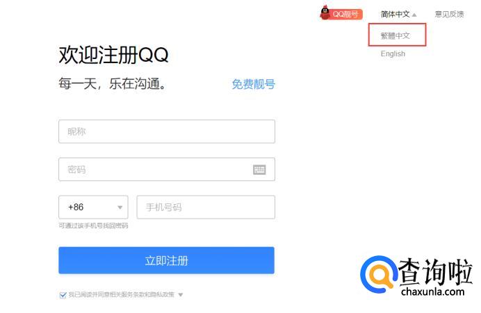 但是因为现在QQ的用户量很大,目前新注册的QQ一般都是11位或者12位的号了。可以回到QQ注册界面,选择页面右上方的“繁体中文”。