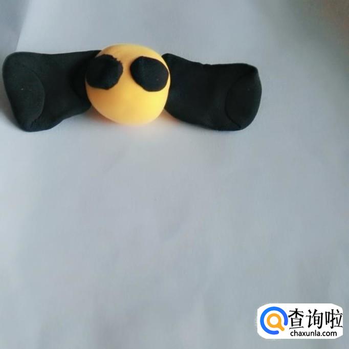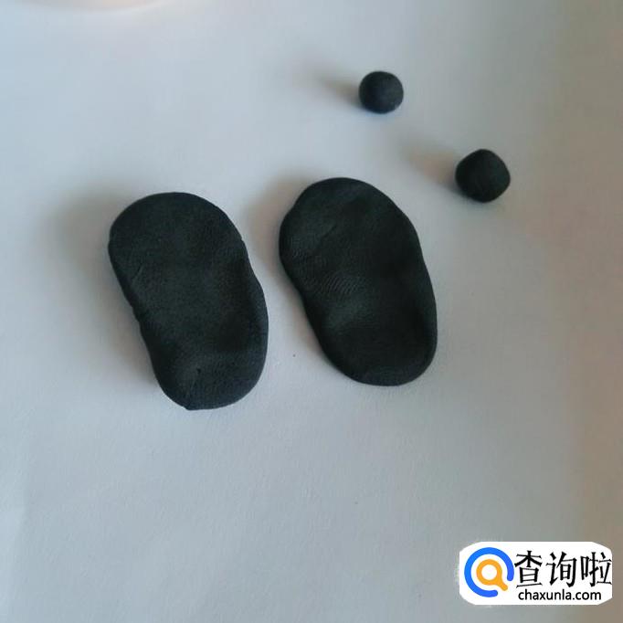 再拿出黑色的超轻粘土来做小狗狗的眼睛和耳朵。都是先搓在圆形,再搓成条形,再压扁做成了耳朵,今天的耳朵做的太大了。再把黑色超轻粘土捏成二个眼睛。
