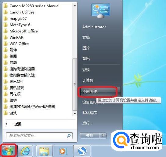首先,点击开始菜单,选择“控制面板”,点击进入。