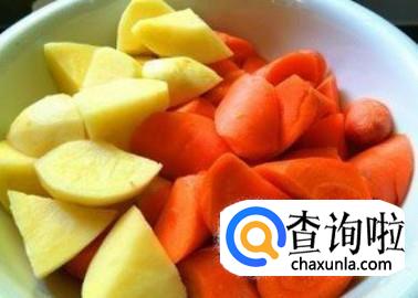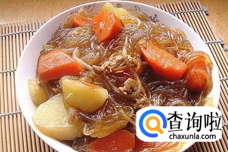 首先把土豆、红萝卜去皮,然后切成棱角形小块,红薯粉丝准备好。
