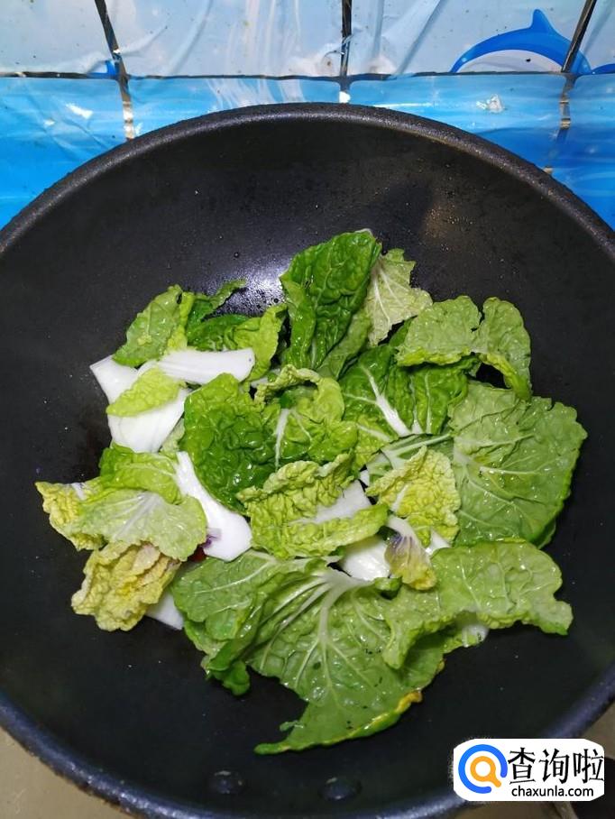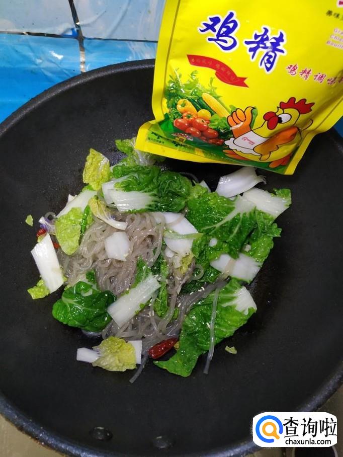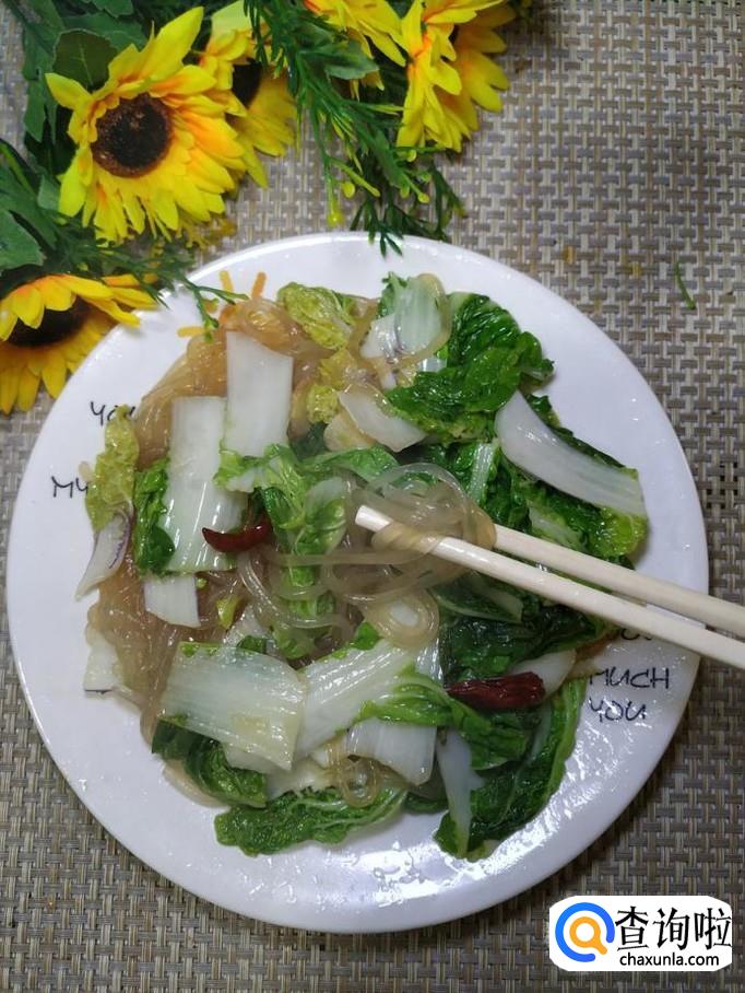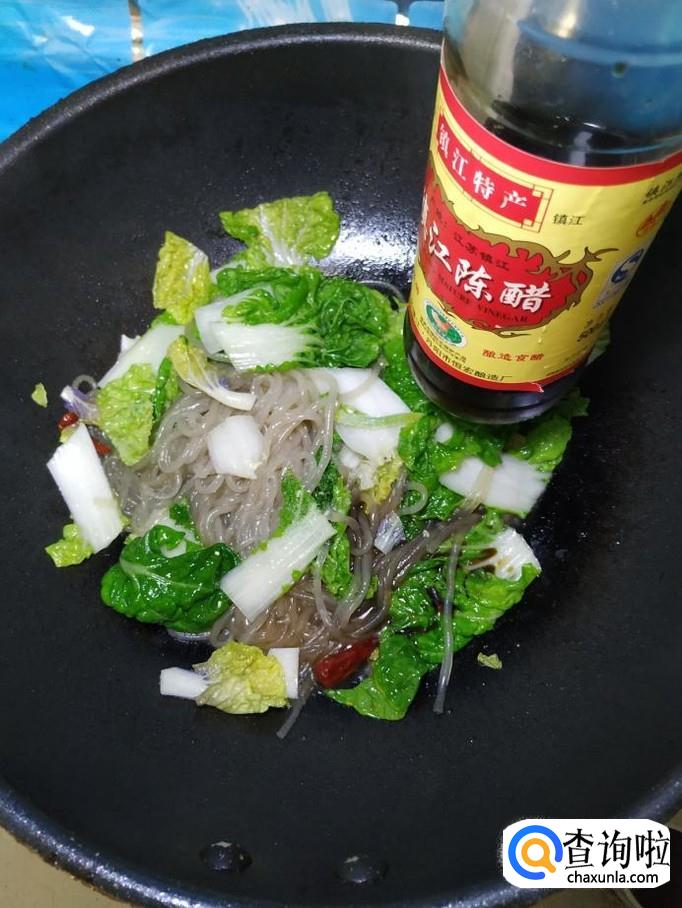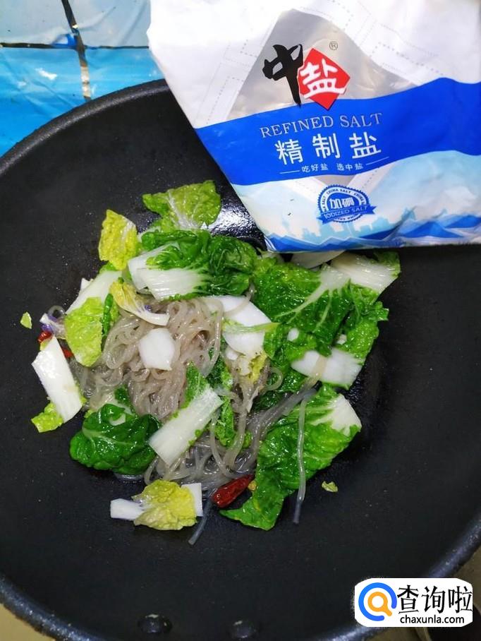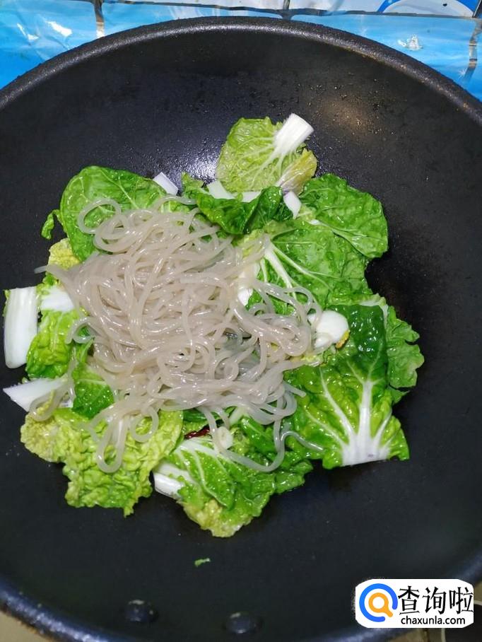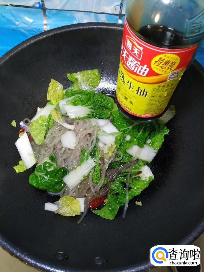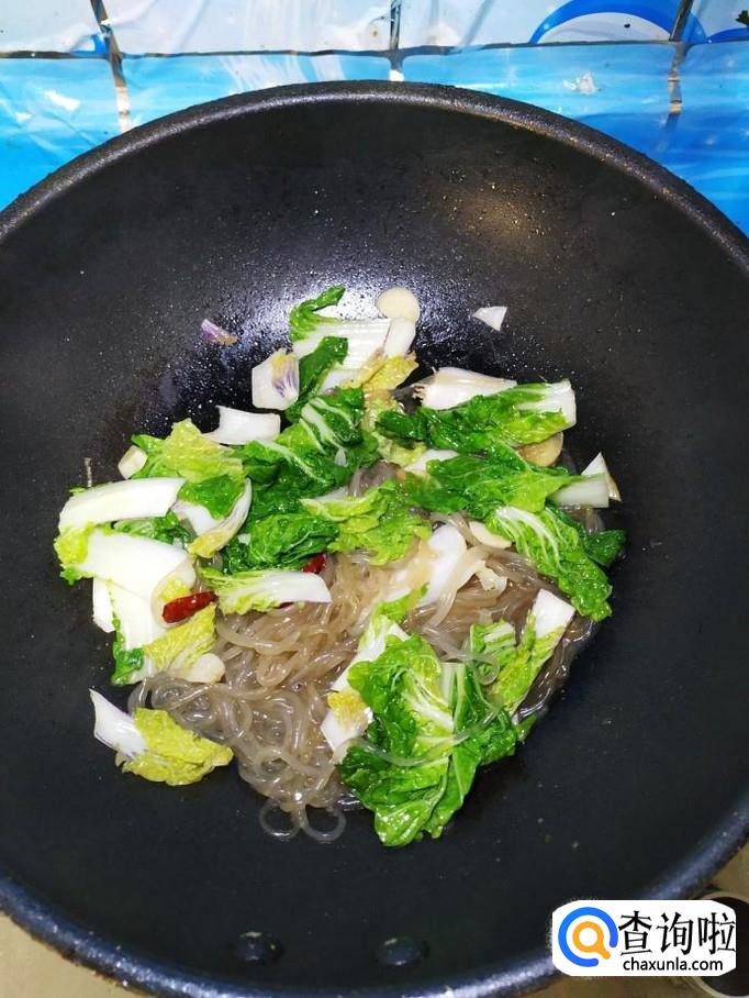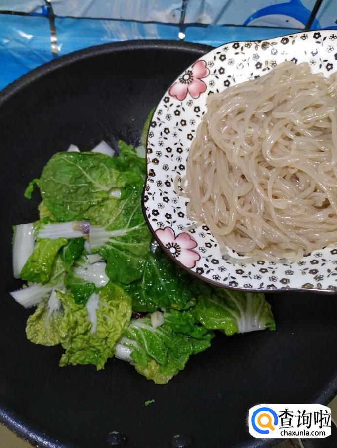 炒至菜开始变软,然后将粉条倒入锅中,翻炒均匀。