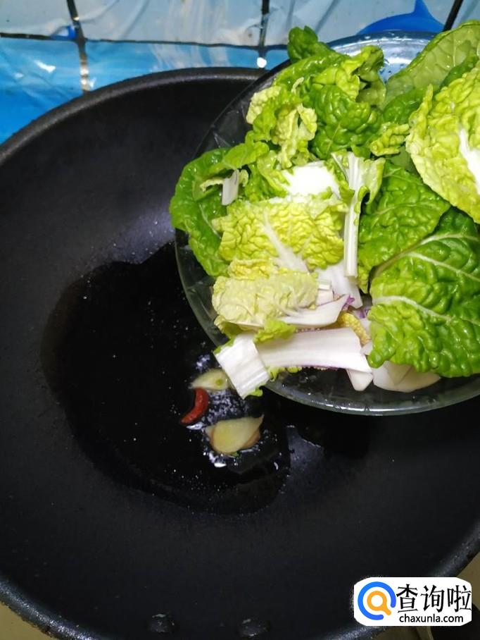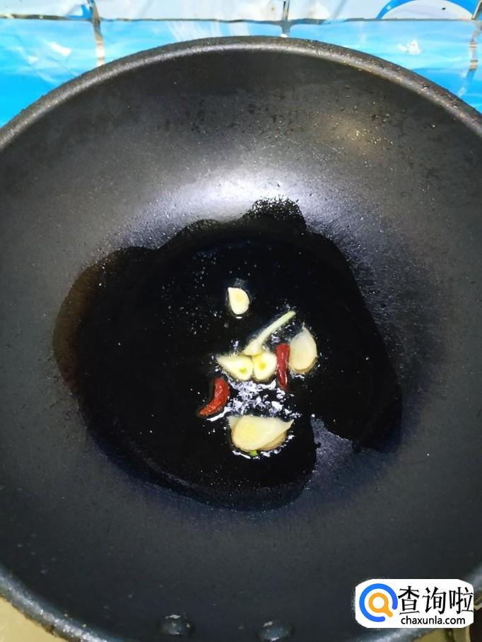 炒锅中放入适量油,油热后,放入蒜片和干辣椒炒香,然后将黄心塔菜倒入锅中翻炒均匀。