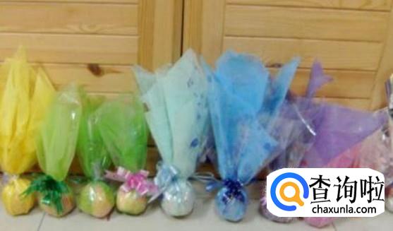 用彩色的包装纸包装苹果,或者用两种色彩的包装纸重叠在一起包,将苹果放在中心位置,将包装纸四边合在一起,然后再用丝带打一个蝴蝶结即可。