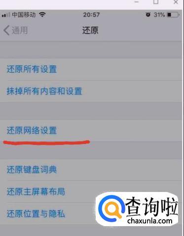打开“设置”,进入页面找到“还原”点击进去,再找到“还原网络设置”点击它,就可以重启手机了,这里要注意了,当我们设置好“还原网络设置”手机开机后会自动清除了所有的WiFi密码。