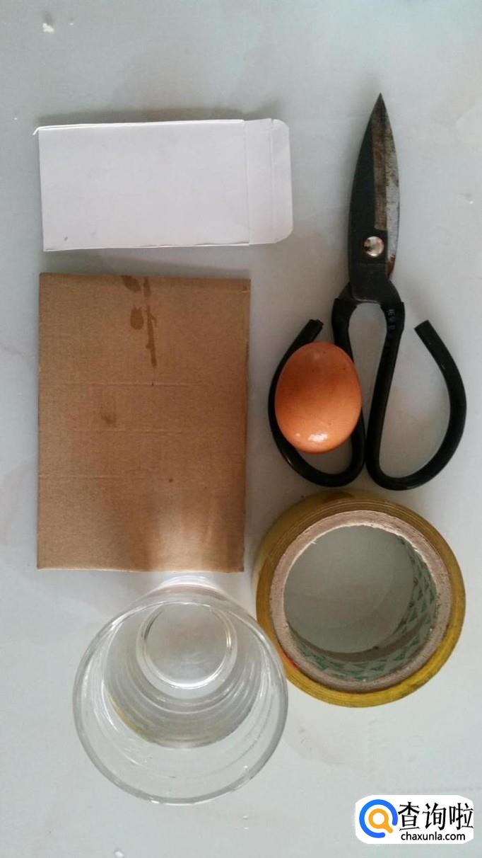 鸡蛋一个(熟),不同大小硬纸片两张,半杯多水,胶带,剪刀