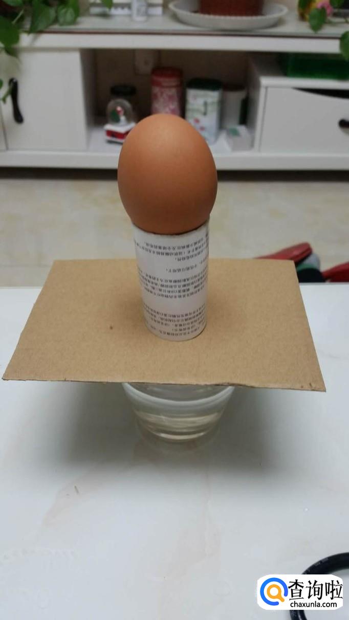 接着把卷好的小圆筒放在名片上,最上面放上鸡蛋。