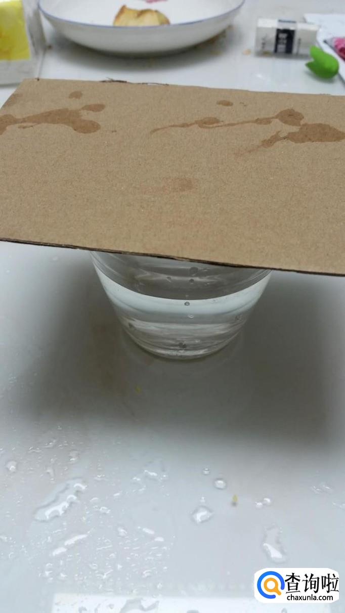 将水杯倒入半杯多水,把另一张硬纸片放在水杯上