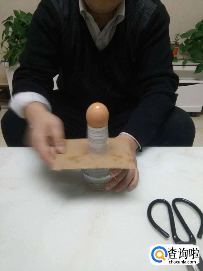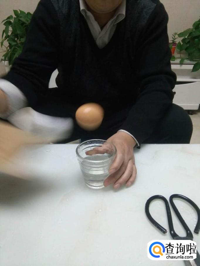 底下的名片一定要快速的抽掉,否则鸡蛋掉不到水里。