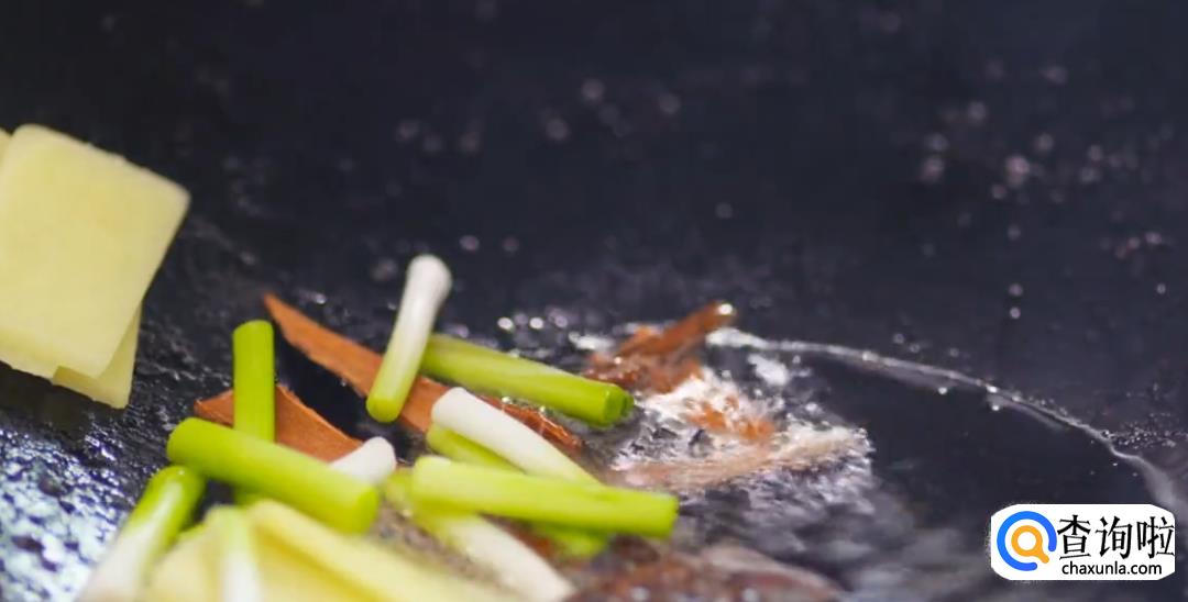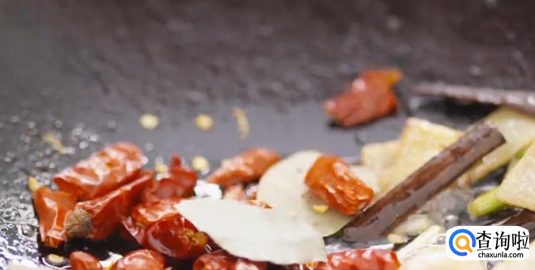 热锅起油,下蒜苗段,姜片,桂皮爆香,片刻后再倒入干辣椒,蒜瓣继续煸炒,然后下五花肉。