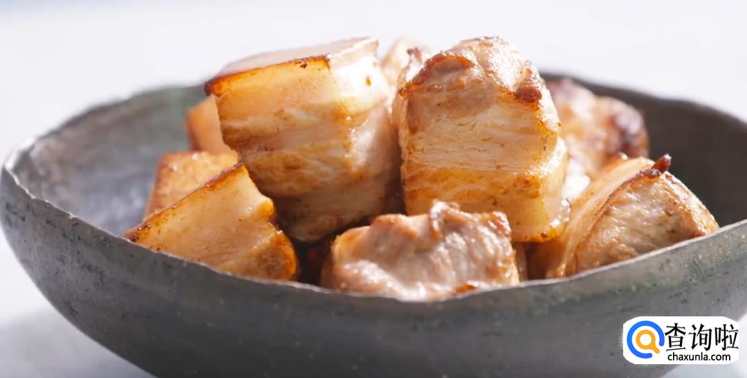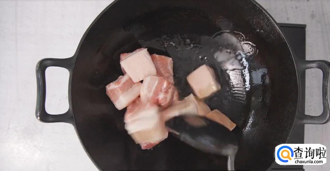 热锅起油下五花肉,倒入少量料酒然后翻炒至表面焦酥,盛碗沥油。