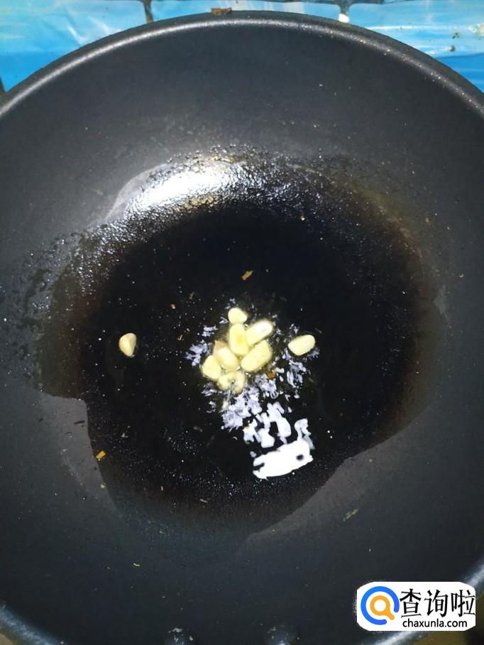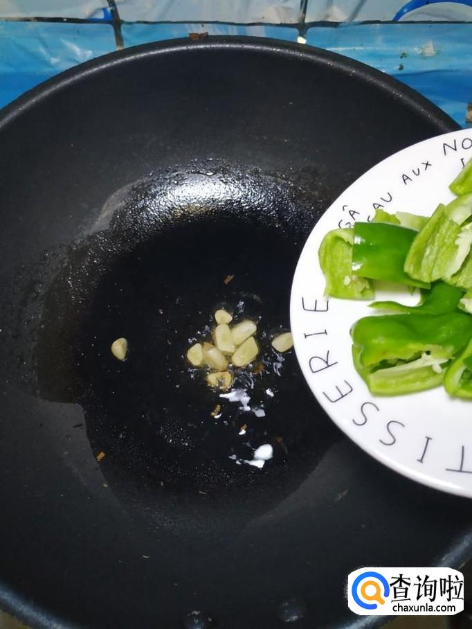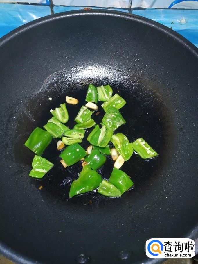 准备适量蒜,剥去外皮,切成片备用,炒锅中放入适量油,油热后将蒜片,放入锅中炒香,然后将准备好的青椒块儿,倒入锅中,翻炒均匀。