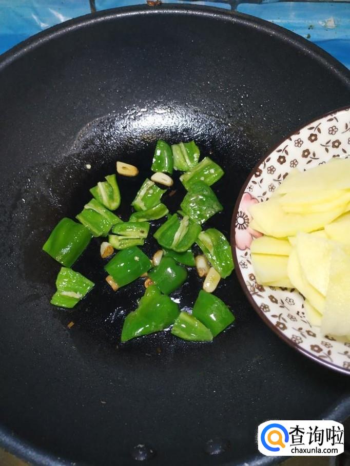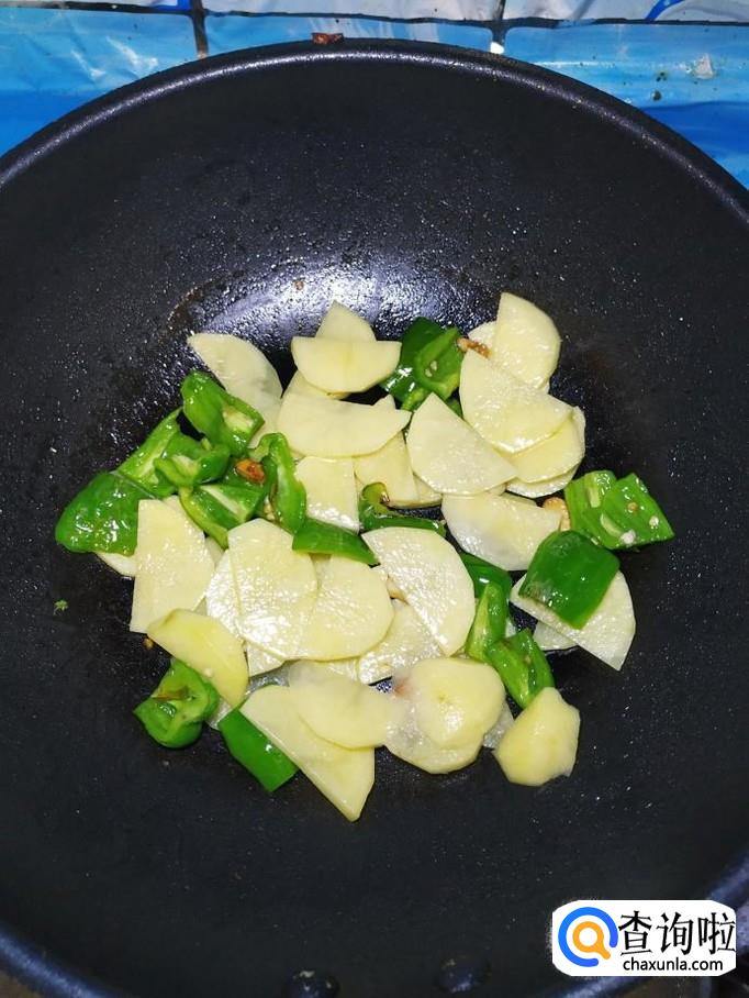 青椒炒香之后,将准备好的土豆块倒入锅中,和青椒一起翻炒一下。