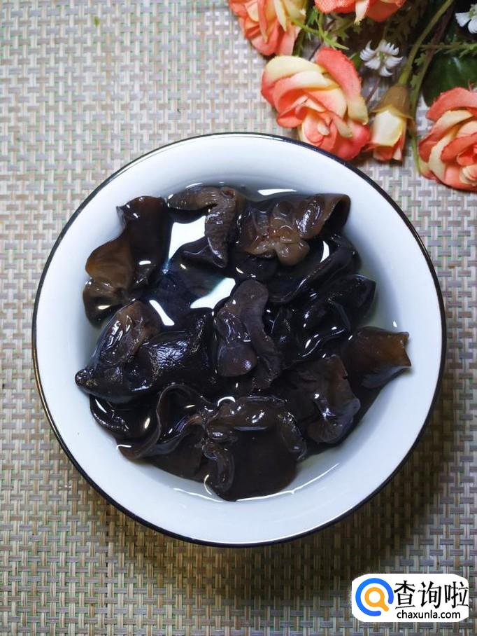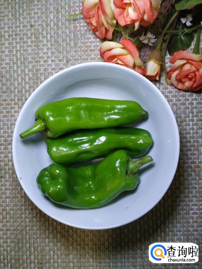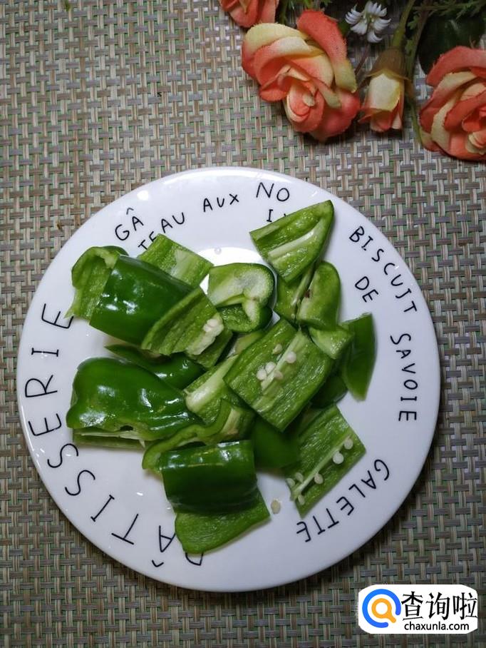 准备适量青椒,洗净后,用手剥开,切成块,放入盘中备用;再准备适量木耳,用清水泡发,撕成小朵儿备用。