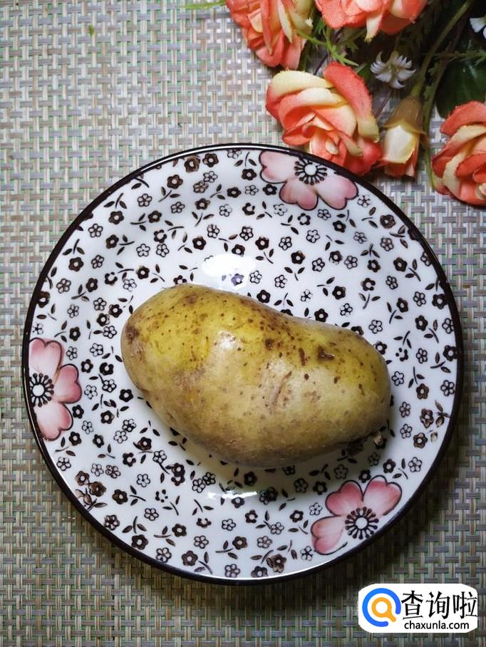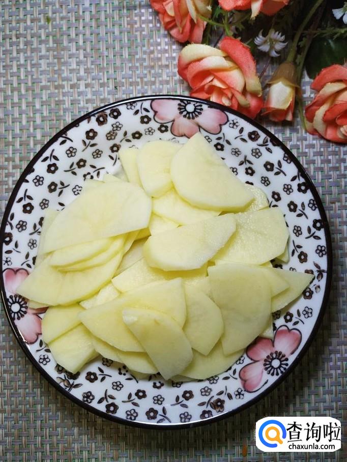准备一个土豆,洗净后去皮,切成片儿,洗去淀粉,放入盘中备用,注意,切的时候可以先切成大片,然后从中间再切开就可以了。