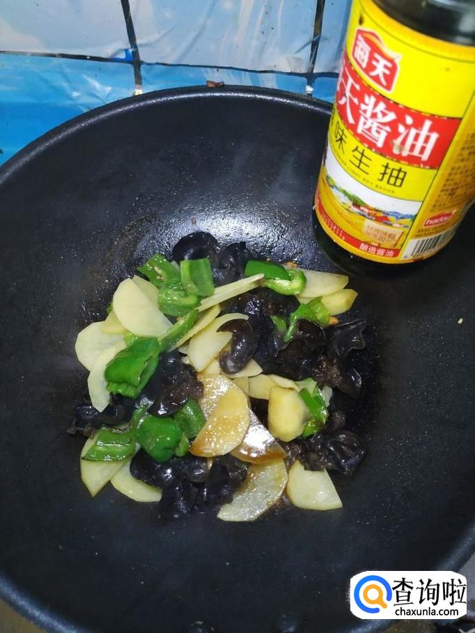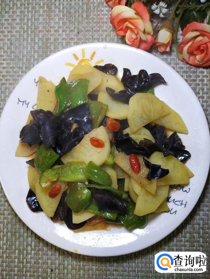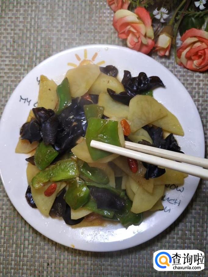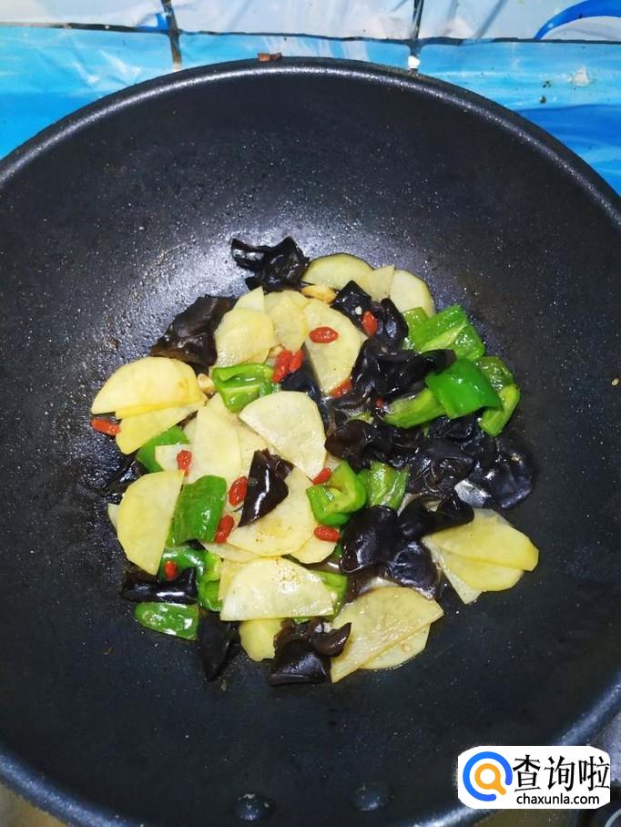 土豆适量,青椒适量,木耳适量,枸杞子适量,盐适量,鸡精适量,五香粉适量,生抽适量,陈醋适量。