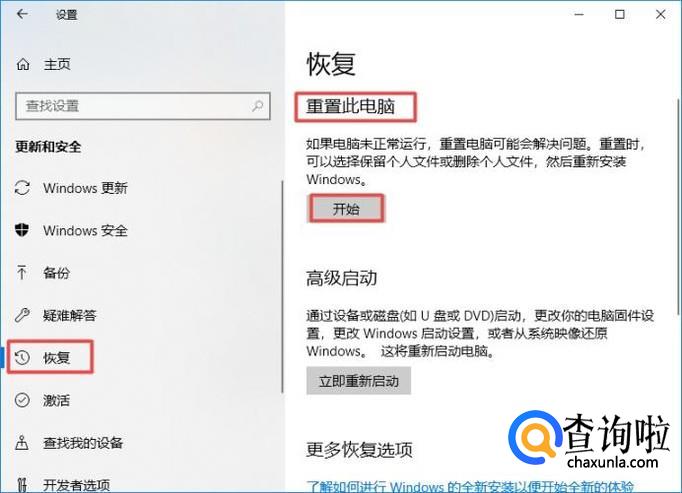 然后我们点击恢复,之后我们点击重置此电脑中开始;