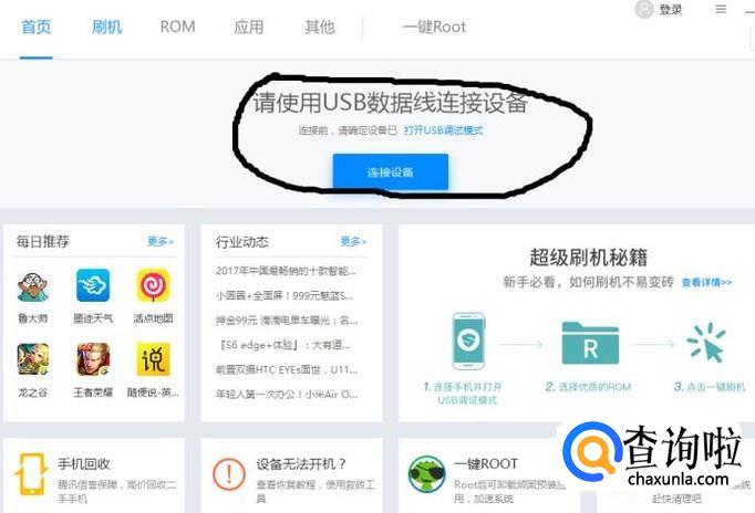 然后回到桌面启动刷机精灵,并且使用USB线将手机和电脑连接,等待电脑识别手机