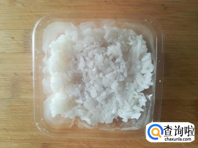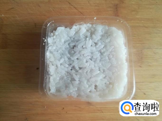 把蒸熟的糯米放入一个塑料盒里,用勺子抹平。