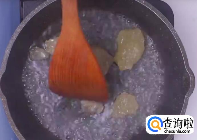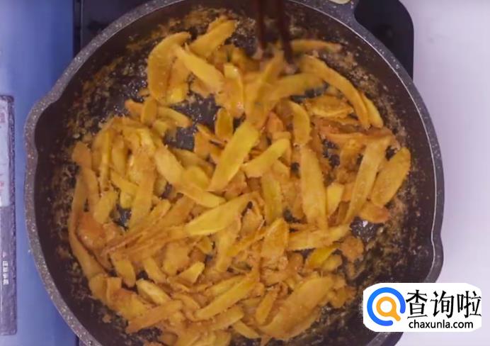倒入生姜片,耐心把水份炒干。过程一定要不断用勺翻炒才能让姜片充分吸收糖分,不可以等糖水自己干锅。