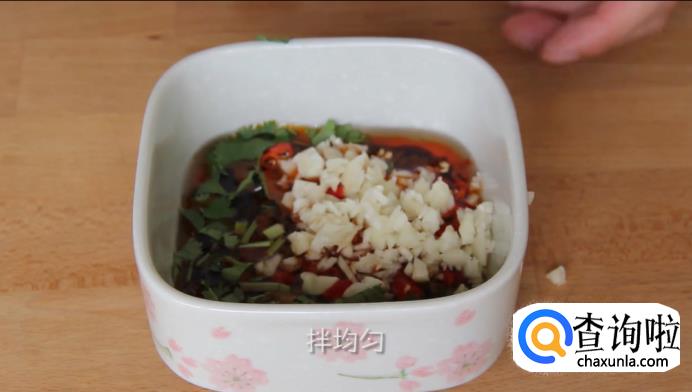 【调料】芝麻油20克、红油20克、生抽20克、香菜1颗、大蒜3瓣、小米辣5个