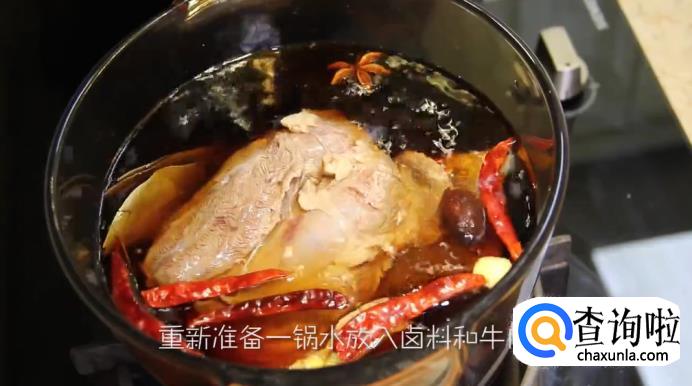 重新准备一锅水,放入生姜片、桂皮、干辣椒、草果、八角、香叶和料包,再加入冰糖、料酒、生抽、老抽、盐,最后放入牛肉,盖上锅盖,大火烧开后转小火煮1个小时,煮好后隔夜入味。