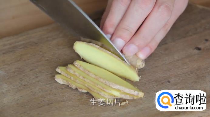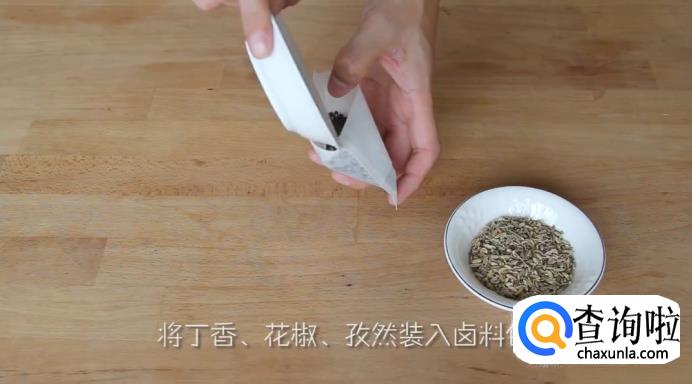 首先,将丁香、花椒和孜然装入卤料包,装好后把卤料包密封好。再把生姜切片,放在一旁备用。