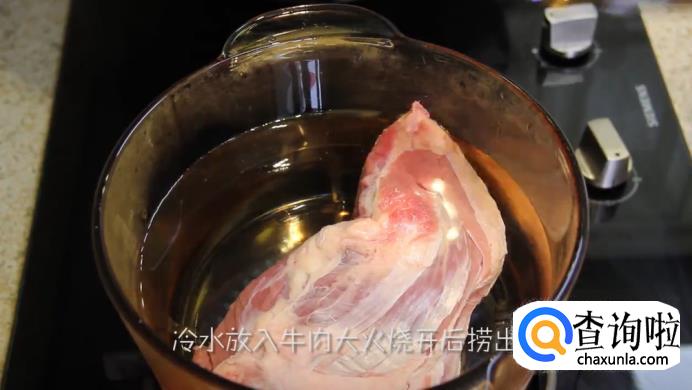 接着,锅里放入冷水,将牛肉放进去,大火烧开后将牛肉捞出。
