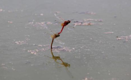 有趣的是,雌蜻蜓在点水时,雄蜻蜓惟恐"妻子"失足落水,便飞翔在雌蜻蜓的前上方,用它的尾尖钩住雌蜻蜓的头部,拖着它在水面产卵,所以,有人称雄蜻蜓为"助产士"。