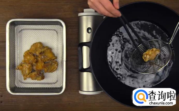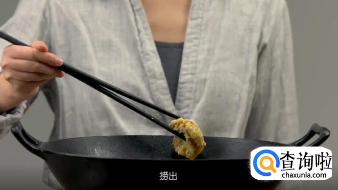 接着,在锅里倒入色拉油,加热烧至油温160度左右,将鸡块下锅,炸4-5分钟,保持中火,将鸡块炸至浅黄色后捞出,放置3-4分钟沥油。
