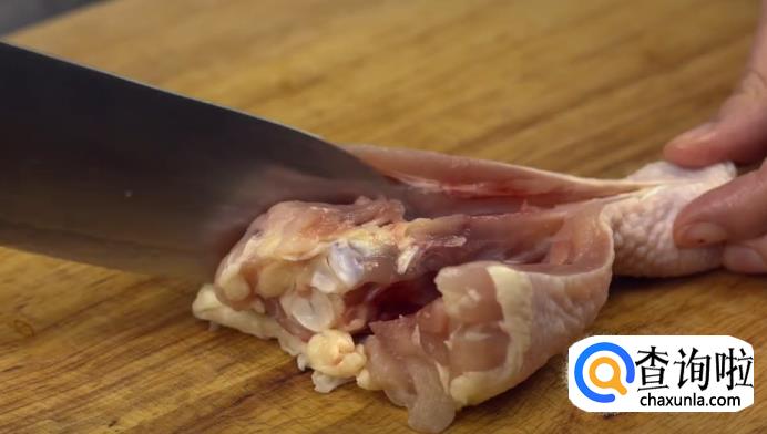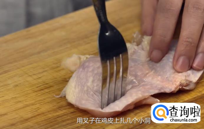 好吃的炸鸡块需要选取带皮的鸡腿肉,将鸡腿洗干净之后,去掉骨头。用叉子在鸡皮上扎几个小洞,这样可以防止鸡皮过度收缩。