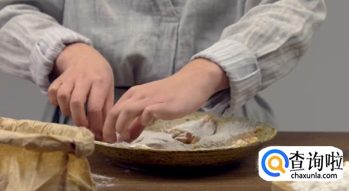 冷藏好之后,将鸡块取出,在炸之前要先裹粉,低筋粉和太白粉的比例是1:1,在鸡肉上撒低筋粉抹匀,再加入太白粉,以同样的方式涂抹,这样能使炸出的鸡块外酥里嫩。