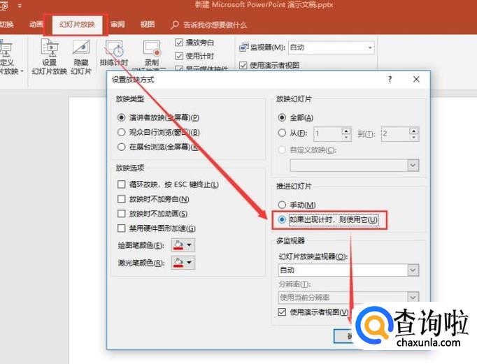 设置”幻灯片放映“,在推进幻灯片中设置”如果出现时,则使用它“,点击确定。设置完毕,赶紧去体验一下吧。